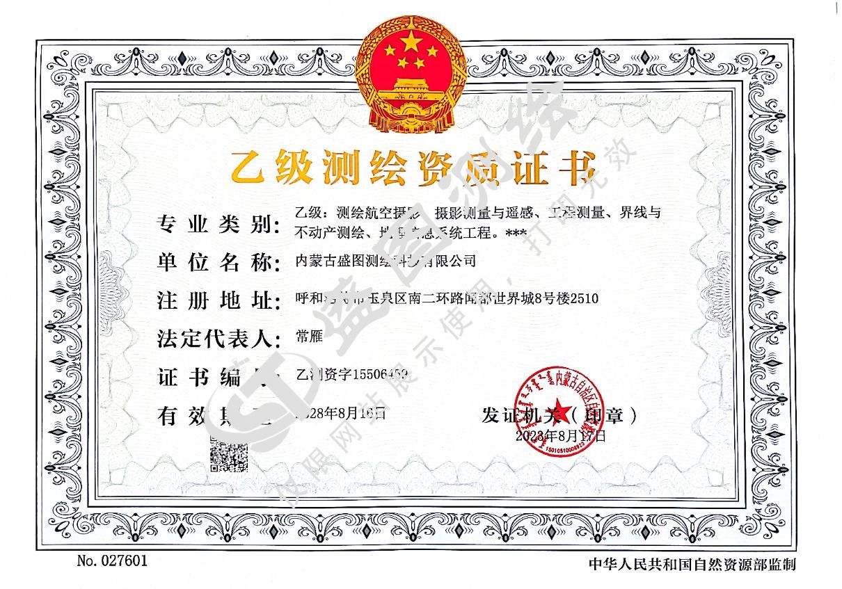 内蒙古盛图测绘科技有限公司,成立于2006年,一直致力于地理信息系统的深耕专研,是一家集研发、销售和测绘地理信息技术服务为一体的综合空间信息及相关产业的高科技公司。公司现具备乙级测绘资质、乙级土地规划资质、民用无人机驾驶航空器经营许可资质。业务范围涵盖工程测量、测绘航空摄影、地理信息系统、不动产测绘、地图编制、国土空间规划、土地利用总体规划、土地利用专项规划以及其他土地利用规划编制、评估修改、论证、咨询等领域。承接专业化技术培训、航测、倾斜、考古、文物等三维建模工程业务。